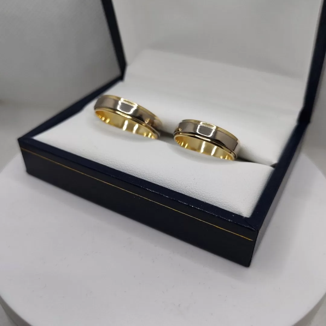Par de alianzas en oro 18K, bicolor oro amarillo y oro gris, 6mm de ancho, grabado láser de obsequio con la compra, fabricadas a medida en 🇺🇾🇺🇾.