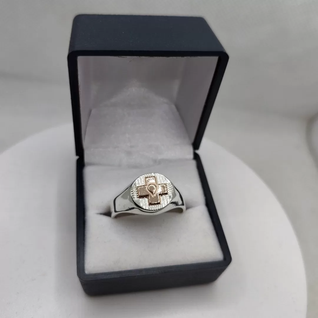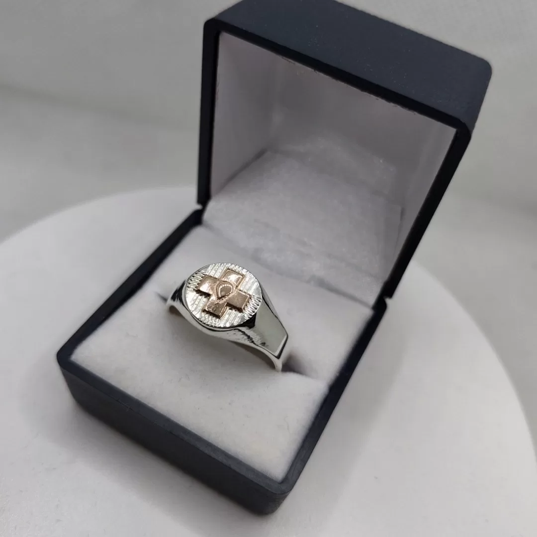 Anillo plata con logo en oro de la profesión que necesites.